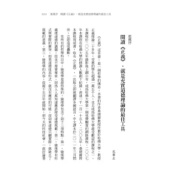 ◎桑德爾實踐了最優秀的學術平民主義,以簡單易懂的方式呈現彌爾與羅爾斯的思想,卻沒有加以簡化……他釐清了一項基本的政治鴻溝——不是介於左派與右派之間,而是介於另外的兩個陣營之間,一方認為沒有比個人權利與選擇更重要的東西,另一方則是宣稱植基於道德信仰的「共善政治」不能被忽略。──《華盛頓郵報》