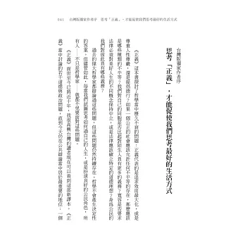 ◎桑德爾這部廣泛探究各種熱門議題,以及永恆不墜的哲學問題的著作令人讚嘆不已……博大精深、文筆流暢且深富人文關懷,這是能夠真正改變人的讀物。──《出版者週刊》