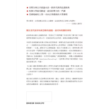 ◎桑德爾對於正義理論的解說……清楚明白又具有即時性。《正義》以我們所有人都能夠理解的方式,令我們面對那些潛藏在衝突之下卻經常沒有得到承認的概念。──《紐約時報》