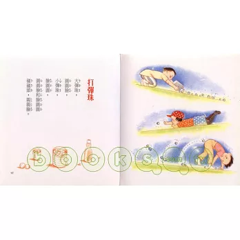 本書以童玩為主軸,運用絕妙的文字創意,寫出20首可讀、可玩的創作兒歌:帶小讀者大玩跳房子、放風箏、打彈珠、紙飛機……。例如:孩子最喜歡玩的「捉迷藏」,作者把孩子在遊戲中盡情玩樂的景象,表現的淋漓盡致;又如在「扮家家」一文中,作者將孩子以大樹當家、石頭做籬笆,香香的野花是桌上的美味佳餚等遊戲場景,自然輕鬆的表現出來,享受扮演遊戲的樂趣。這本書大、小孩可以一起共讀、一起玩耍,享受純真的童年時光。