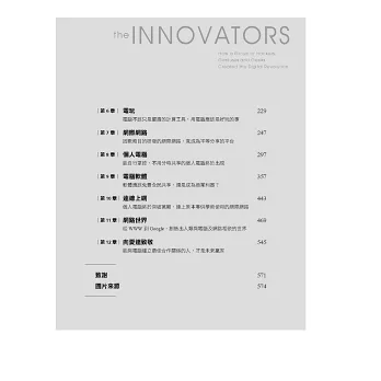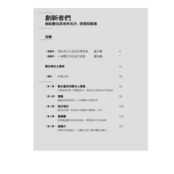 《創新者們》闡述資訊科技的發展歷史,介紹諸多科技發展傑出人物,從數學的模型創建到半導體發明的歷史人物,故事豐富、人物精彩、層次分明,很值得細細品嘗。──童子賢,和碩聯合科技董事長