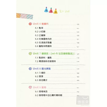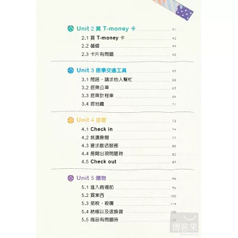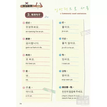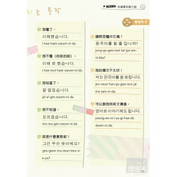 「常用句子快指區」收錄自我介紹、免稅購物、購物付款、請求協助拍照以及結交韓國朋友時重要句型,讓您不用再慌慌張張翻書,找不到那臨時需要的一句話