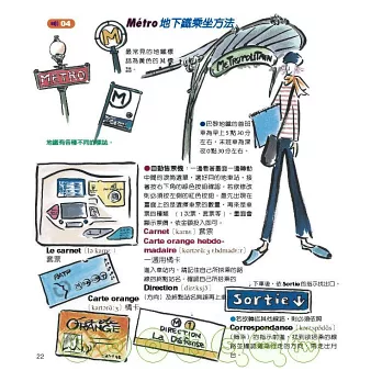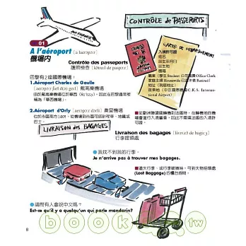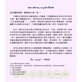 本書是針對即將到法國旅遊的人所編寫。希望讀者能於旅途中多加活用本書。書中插圖皆附法文,單字部份則加附音標及英文說法。許多人認為“法文發音好困難……”尤其是一開始對於發音完全摸不著頭緒時,這時插圖便可以發揮它的功能了。只要將插圖指給對方看,對方一定能夠了解。
