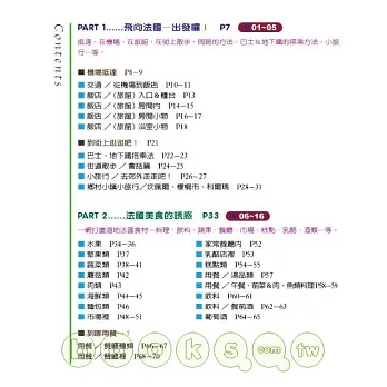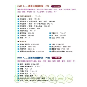 書中並沒有出現太多會話型式的法文。不過,我們會介紹一些發生狀況時所必備的救急會話短句。相信跟一般的法文會話書有很大的不同。您也許可以在本書中發現一直以來想買的生活雜貨、廚房小用品、甚至衣服、配飾…等時尚流行語彙的法文說法。這些東西的法文名稱及插圖都會詳細地出現在本書中哦!需要時常接觸法國時尚流行的人一定不能錯過本書!