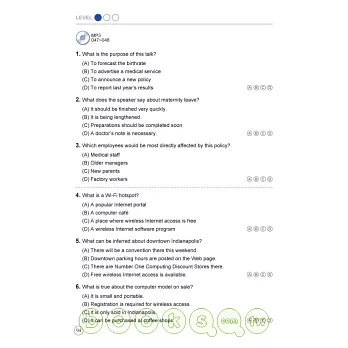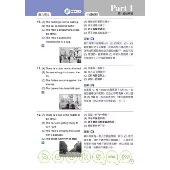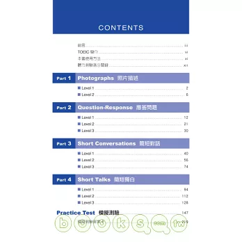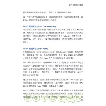 本書比照正式聽力測驗,分成四大部分。每部分皆提供豐富試題,並依難易度分類,是考生大量練習的最佳教材。試題皆提供獨家解析,訓練考生掌握NEW TOEIC聽力測驗的出題重點、迅速解題,以爭取時間準備下一題。有別於其他同類書籍,本書在難度較高的part 3及part 4單元,就考題出現的連音、削弱音部份,個別解說,提醒考生留意發音變化、掌握正確的發音方式。