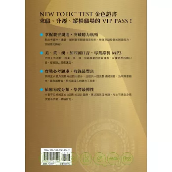 《NEW TOEIC TEST 金色證書─聽力》是由居於日本領導地位的The Japan Times出版社與眾文圖書公司所合作出版的系列叢書之一,並由日本最著名的留學考試外語學院Institute of Foreign Study教師團隊,經過長期分析TOEIC試題、研究考題趨勢後,所精心編寫的題庫本。