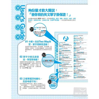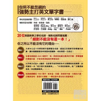 《英文單字保證班—暢銷增訂版》全書收錄超過8000個單字,厚實穩重的書籍份量,才能有根深柢固的學習成效。它是一本考用與生活學習均受用的英文單字書,以字典方式從A-Z編排,收錄範圍囊括7000單字、多益、托福、英檢初中級、大陸四六級、公職高普考、香港PTE測驗,一舉征服中港台各大英語考試!每一頁都是能廣泛應用的字彙,一本《英文單字保證班》的內容就足以抵過市面上的3本單字書,但價格絕對親民又划算!
