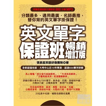 《英文單字保證班—暢銷增訂版》是張慈庭英語研發團隊集結多年的英語教學精華,用心編寫出第一本專為學習者消除障礙、建立自信進而活用單字的英文單字作品,還沒上市就已經造成學生之間熱烈的討論與期待,且擁有20位高中英語名師、補教界搶分名師的熱情聯合推薦,絕對是今年度最值得購買的英語學習書!