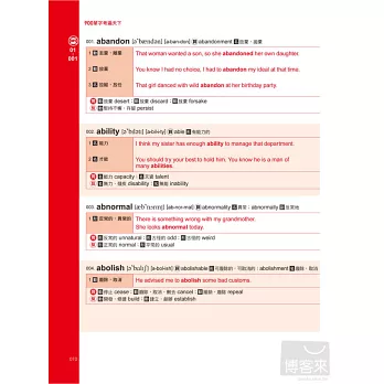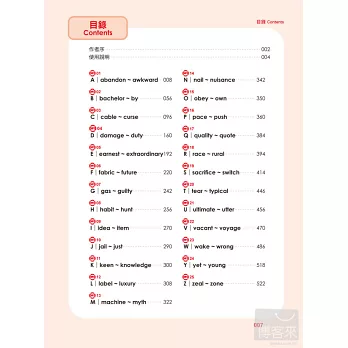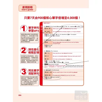 全書整理出考試時出現頻率最高的900個核心單字,除了詳盡的中文解說,同時衍生約4,000個同義字、反義字及相關片語用法,馬上讓你舉一反五,單字量迅速倍增。