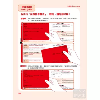 (1)聽著學:並利用色片將例句部分遮住,並播放MP3,MP3播放完畢後將色片移開,對照英文例句文字,可確認自己的聽力理解程度。