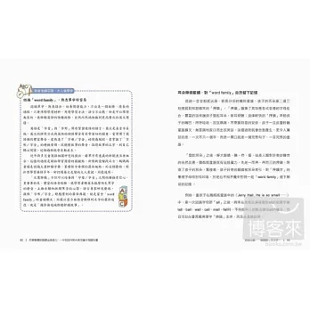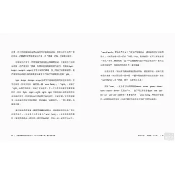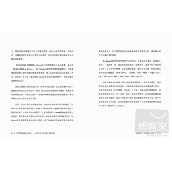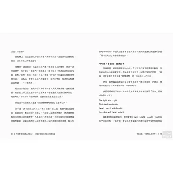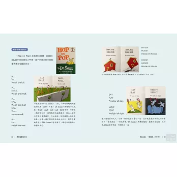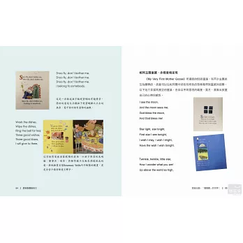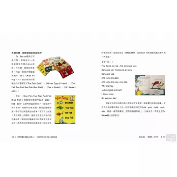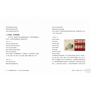 2.100本英文有聲書單:作者極度熱愛兒童英語繪本,不斷搜尋找好書,包括鵝媽媽童謠、Dr. Seuss押韻故事與兒歌,以26個字母為主題的ABC字母書、適合兒童閱讀的科學有聲書等。透過故事內容解析、作、繪者特色,佐以學理印證、安排播放順序,並經過雙胞胎兒女驗證,提供父母省錢又有效率,比補習班實惠的學好英文的有聲書閱讀計畫。此外,也針對家長的疑慮,根據實際播放經驗,與兒女、學生聆聽有聲書的各種反應,以貼近家長需求的FAQ型式,找出解決之道。