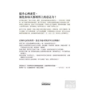 意志力不是一種美德,而是心理能力與生理能力的結合。更棒的是,意志力像肌肉一樣可以鍛鍊!但不必懸梁刺骨,也不必臥薪嚐膽,只要掌握意志力的本質,就可以在該去做的時候積極行動,該拒絕的時候堅定說不。它,比IQ、EQ,對你的人生影響更大!