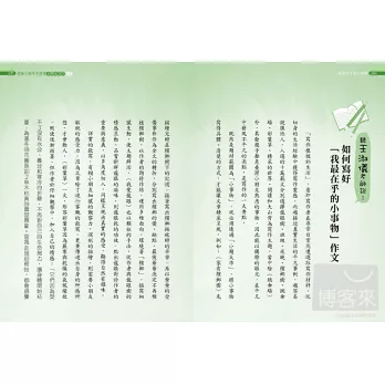 作文書光教技巧還不夠,《國語日報 年度嚴選 小學生作文100》嚴選100年度兒童藝文版所刊登過的作文,從中挑出100篇優良範例,分為13個作文類別,學生能依欲練習的作文類別快速查找,瞬間聚焦。