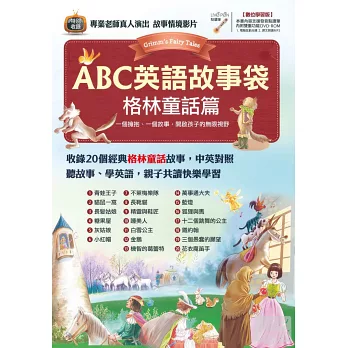 《ABC英語故事袋 格林童話篇》收錄二十篇經典的格林童話,包括《青蛙王子》、《睡美人》、《小紅帽》、《糖果屋》、《灰姑娘》等耳熟能詳的故事。用簡潔的文字、生動的彩繪插圖及有聲書的方式,提供另一種閱讀體驗,讓讀者從精彩動人的故事情節中提昇英語學習興趣。父母可以帶著孩子看故事、學英文,較大的讀者也可以利用本書當作輕鬆閱讀的起步。