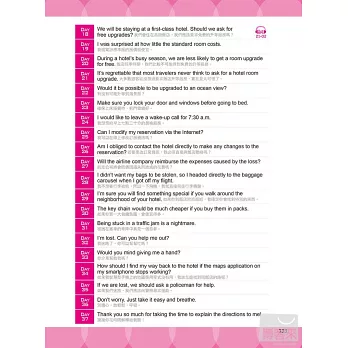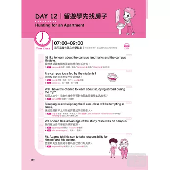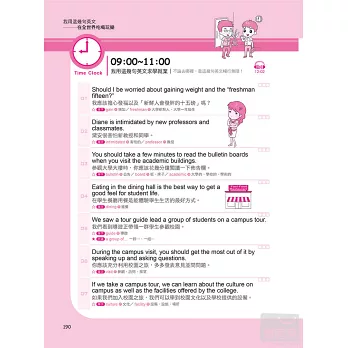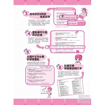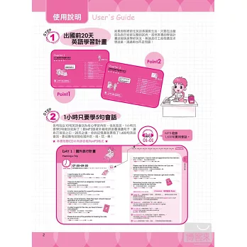 各時段以10句英語會話為核心學習內容。也就是說,1小時只要學5句會話就夠了!聽MP3跟著外籍老師反覆誦讀句子,讓自己琅琅上口。20天之後,你的記憶庫就累積了1,600句英語會話。靠這幾句就能在國外吃、喝、玩、樂!