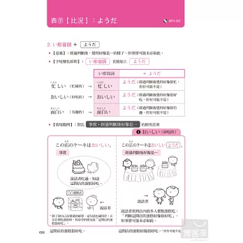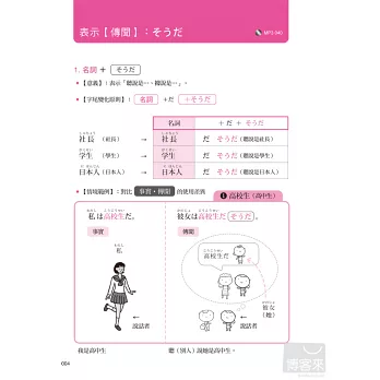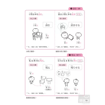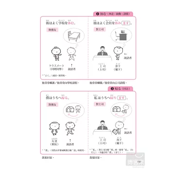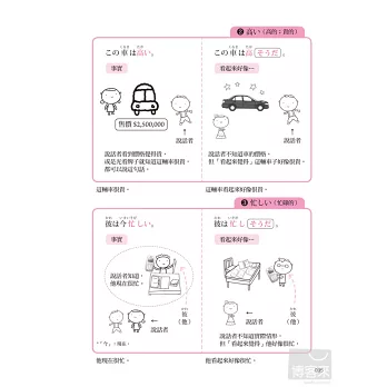 為了充分解說「情境差異」造成的「日語文法使用差異」,圖解情境範例時,採用「左右兩格對比式」圖解法。「肯定」對比「否定」,「事實」對比「傳聞」,「現在」對比「過去」,透過「動詞原形」對比「字尾變化」,洞悉差異,就能從根本瞭解「字尾變化」的所有道理。