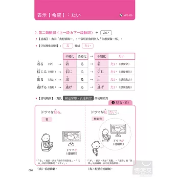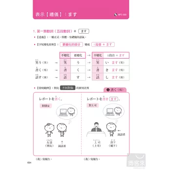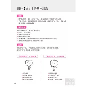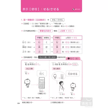 這就是日語複雜的「字尾型態」及「音便」差異!本書除圖示化解說「字尾型態」,並將最繁複的「第一類動詞」(五段動詞)區分為「原形字尾:す」、「原形字尾:く、ぐ」、「原形字尾:ぬ、む、ぶ」三大類,針對「促音便」、「鼻音便」等逐一解說,一看就能熟練字尾變化後的發音差異。