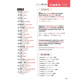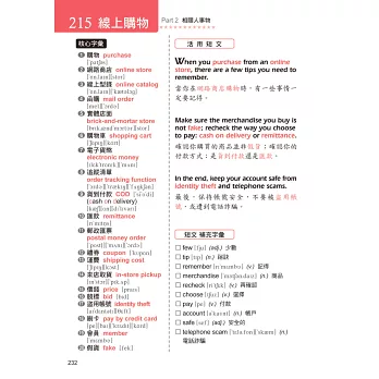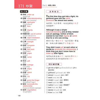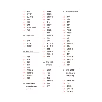 學習英文時,我們總想知道:「這個字,英文怎麼說?」可是有些語彙無規則可循,不容易找到答案。本書特別大量收錄這一類的單字。例如:發呆(absent-minded)、填鴨式教育(rote learning)、畫重點(underline)、酒測(breath test)、無人接聽(no answer)、好感(good feeling)、反感(bad feeling)……等,滿足非英語系學習者的需要。