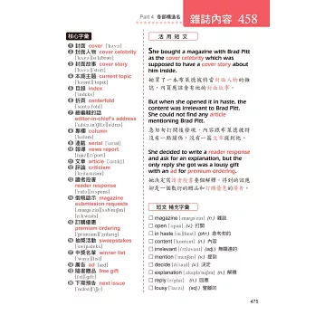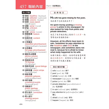 每一主題,都有一篇利用「核心字彙」所完成的「活用短文」,透過短文可了解字彙用法,同步提昇英語閱讀&寫作能力。