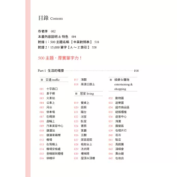 全書共500主題,每一主題包含「20個核心字彙」、「10個補充字彙」。豐富多元的15,000單字,不論自我充實、準備TOEIC、英檢、留學考試,絕對能充分滿足你的所有需求。