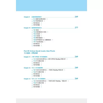 現在終於等到這本書出版,劉老師在 Part I 中討論英文解作的構思原則,在 Part II 中探討我們老中英文寫作的常見問題,而且他花了很多時間在每一個章節的後面加了寫作練功坊跟寫作修理廠,讓讀者把每個章節所學到的重點能夠寫一下,再確實的修一下,這種練習對寫作能力的提升,非常有幫助。不過我全力推薦大家努力閱讀的是 Part III 生存遊戲,在這個部分中劉老師分別用大學入學考試、多益測驗、托福測驗、SAT、履歷表撰寫,分別讓讀者模擬實戰一番,充滿了臨場感。我自己特別把多益測驗的實戰題部分,好好的挑戰了一番,再看老師的修理與修正,非常過癮,大有收穫。