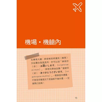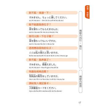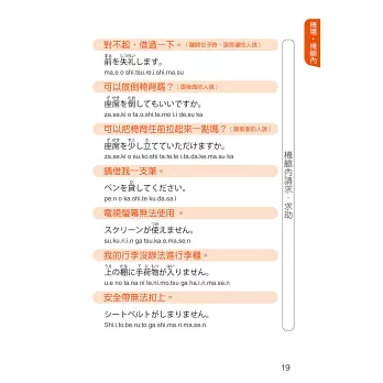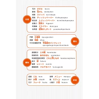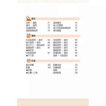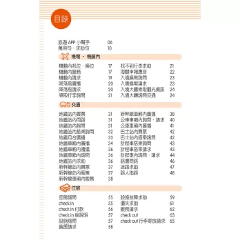 按6大情境分類,好找查。在「機場‧機艙內」時、詢問「交通」時、抵達「住宿」地點時、開始「觀光」巡禮時、大啖美食「飲食」時、殺紅眼「購物」時通通不用怕!