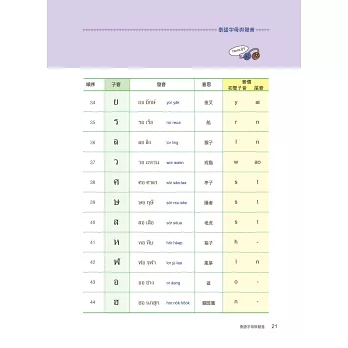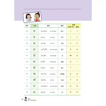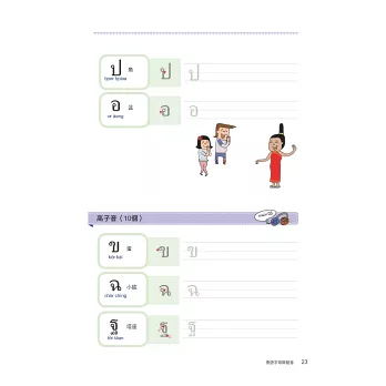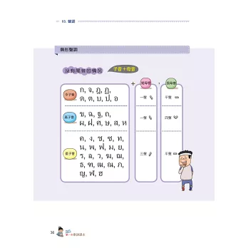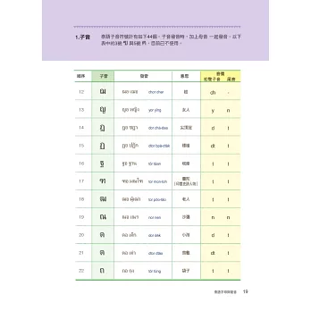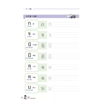 泰語是一種乍看到字形時,不見得能精準唸出發音的語言。子音總共44個、母音32個,聲調5種。其中子音又分為低子音、中子音、高子音三種,依接續的母音不同,會產生不同的發音聲調。因此在基礎字母的學習上必須下很大的功夫才行。本書清楚地將泰文的24個低子音、9個中子音、11個高子音分類學習,每個子、母音也都附有最流通的羅馬拼音協助發音練習,並透過許多詳細的表格圖解,讓讀者能清楚地分類出哪個子音碰到哪個母音時,應該念出哪個聲調,並附有基本泰文數字練習。本書還有書寫格,讓你透過書寫熟悉泰國文字。所有的字母規則規劃成一大章節,作最詳盡的解說。
