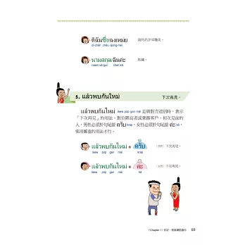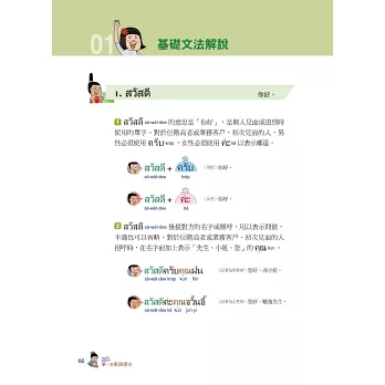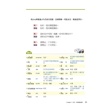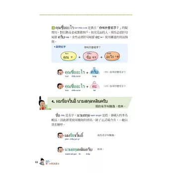 在泰國如果用手指指著國王是不禮貌的,就算是照片也不行,你知道嗎?泰拳的技巧是怎麼樣?在比賽前選手們又會做什麼事來提升自己的運氣呢?還有多少泰國美食能夠讓你食指大動呢?不時穿插在本書的泰國文化趣味性解說,讓你不只是單單學習泰語而已。更能快樂地通盤了解泰國。