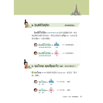 ครับ(kráp)是男性用的禮貌語尾詞、ค่ะ(kâ)則是女性用的禮貌語尾詞,泰語的一些用語男女使用有別,不過能依上表清楚念出來後!是不是開始感到有成就感了?本篇中將帶你馬上踏出泰語的第一步,講解許多與人溝通的基本表達,雖然內容不長,但是千萬不要小看這個篇章。這部分是未來敢開口的重要關鍵。基本表達滾瓜爛熟之後,就能進行更進一步的泰語學習。
