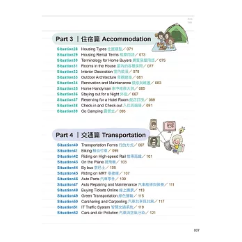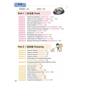 本書將日常生活常用單字分為飲食、服飾、住宿、交通、育樂、環保、健康、科技、自然、理財10大類,再細分成128個小單元,各單元分別歸納出最常使用的關鍵單字共512個。