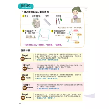 利用空檔時間重新整理筆記,將之前隨筆記下的內容進行補強,從右側的筆記欄中抓出關鍵字,記錄在左邊的「整理欄」。→ 最佳進行時間:學習後20分鐘