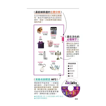 學習單字不能死背,一定要知道怎麼念,才能牢牢記住。特邀美籍老師親自錄音,跟讀學習,學完單字馬上就能開口說,也能利用零碎時間重複聆聽MP3,更熟悉外國人的發音!