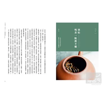 本書以短篇文字,搭配圖片,讓讀者跟著作者,一起品茗、一起沏茶。