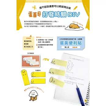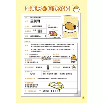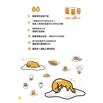 一手便可以掌握實際尺寸的大小,不僅讓你隨時隨地都可以擁有蛋黃哥,這次書中更特別傳授該如何把玩手中的這隻蛋黃哥;甚至作者也首次以親筆手稿的方式公開蛋黃哥是如何誕生的,本書更特別收錄了蛋黃哥和蛋黃人的精彩特別訪談!