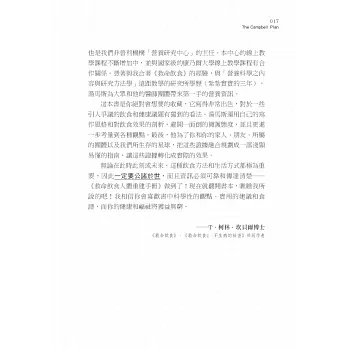 鮮少有醫師能以謙遜和智者的口吻告訴我們事情的真相──我們所選擇的生活方式對於長期健康的影響,比任何西醫的藥物或醫療程序都來得深遠,但坎貝爾博士真的做到了!不僅如此,他更進一步以明確和深入人性的方式解釋,對於已被證實能帶給人們最健康結果的飲食和生活方式,我們到底有哪些選擇。這本優異的作品,獲得我最高度的推薦!──約翰.羅賓斯,《危險年代的求生飲食》作者