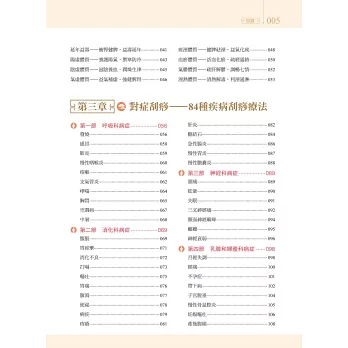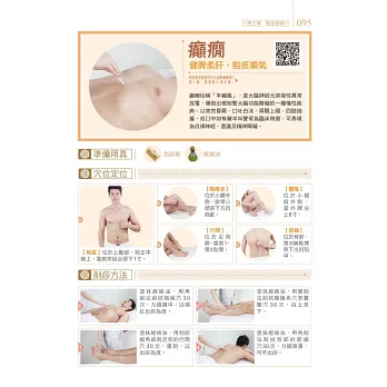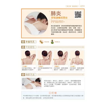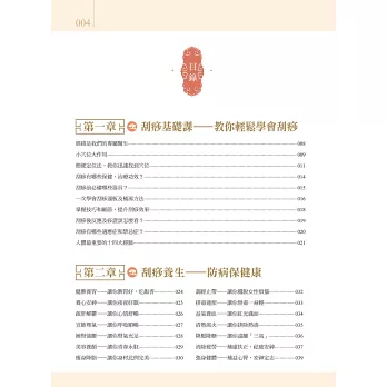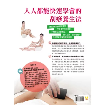 包含現代人常見的五大項目疾病,84種對症刮痧療法,對於感冒發燒、支氣管炎、頭昏中暑、腸胃不適、腰痠背痛、婦科疾病等都有療效。