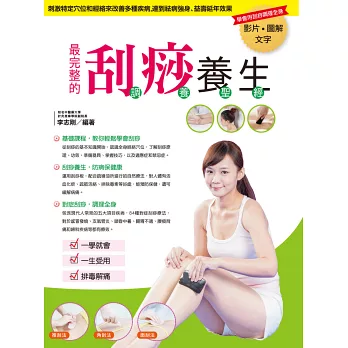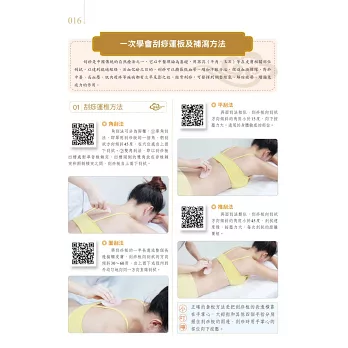 全書高達150多個QR code,對於現代人常見症狀,透過手機或平板電腦掃一掃條碼,就能立即觀賞刮痧的教學影片,指導正確的操作要領,學會刮痧基本運板手法與補瀉方法、穴位的準確尋找,以及如何透過刮痧有效舒緩疾病等。跟著影片做,輕輕鬆鬆,易學好懂。