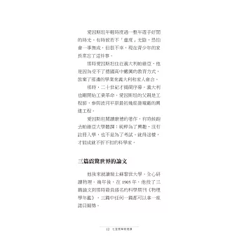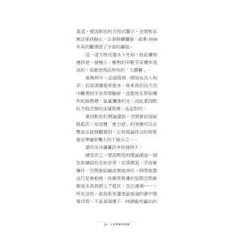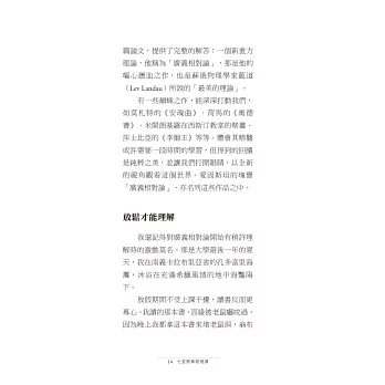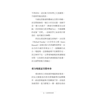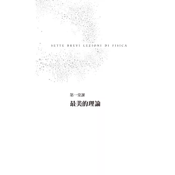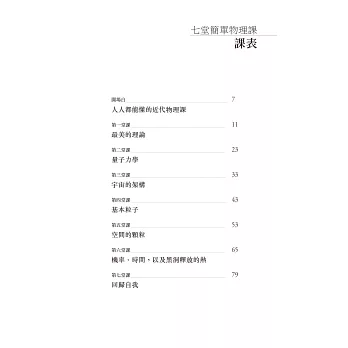 在這七堂簡單明瞭的物理課裡,我們領略了在二十世紀初震撼物理界,而現今仍讓我們驚歎連連的近代物理革命。沒有繁瑣的方程式,作者帶我們輕盈飛過層層障礙,窺見科學與宇宙深刻美麗的內涵。