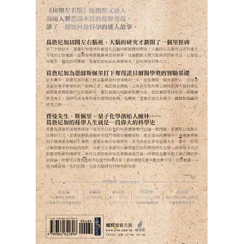 本書為葛詹尼加親筆撰寫,有別於以往他的科普書籍專門討論一個問題,這本書即以他個人自傳的方式,呈現他開啟裂腦研究這門領域的種種過程,處在頂尖的環境中,身邊無時無刻不環繞著有趣的人事物,暨是在進行科學研究,更多的是在享受這個人生。書中,你可以看到費曼拜訪他的派對,主動大方承諾可以讓葛詹尼加切開他的左右腦,前提是不可以影響到他做物理研究;你可以看到他與知名喜劇演員艾倫一時興起在體育館主辦公開的政治辯論;你還可以看到他與多位當代科學名家(諾貝爾獎座在書中數也數不完)交互激盪的過程……這不僅是他一生的紀錄,也是大腦研究科學史的見證。