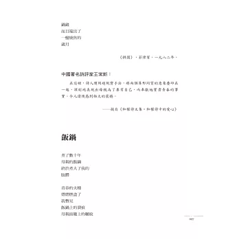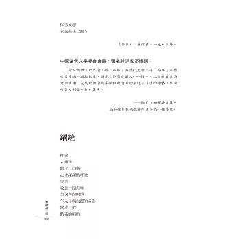 和權的努力和堅持,已有巨大的收獲,在此向和權道賀,並容許我説一聲敬佩之至。──台灣名詩人 向明