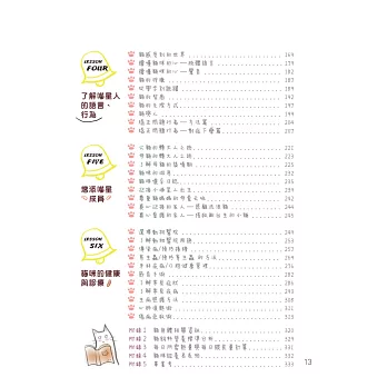 從迎接喵星人的事前預備、挑選麻吉的貓、領養、布置新家與規劃空間,到生活起居細節、幼齡貓照顧、貓的飲食學問、健康、診療、教養、帶出門……以及牠們最抗拒的剪指甲、洗澡、梳毛等問題,皆有對策。
