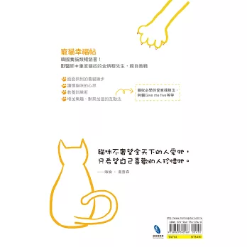 除了日常照護,還要懂得如何與喵星人相處。金炳穆老師教你從貓咪的動作、語言,理解牠的心,並用貓咪喜愛的方式親近牠們。即使是戒心高的貓兒,也有建立信賴的五大步驟。
