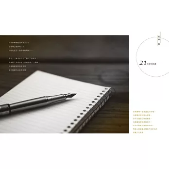 這份計畫以21天為期,學習九段名師之長,以鋼筆字冠軍的運筆路數為底。除了練出漂亮的美字之外,更多了生活的溫度。加上現代人心靈導師阿德勒的勇氣與智慧金句,讓這21天的寫字計畫更加充實與美好。