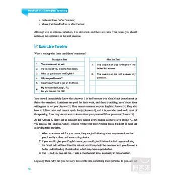 Practical IELTS Strategies系列就是教導考生如何在IELTS考試獲得好成績的最佳工具書。本書內容涵蓋文法及字彙,提供20個學習秘訣(Tip)和相應的40個練習題,每個秘訣均互相扣合,考生能循序漸進學習閱讀要領、牢記答題技巧。最後則列出所有學習重點摘要,並附有四回測驗題,讓考生一次複習所有技巧,應用於答題之中,必能在考試中獲得高分。