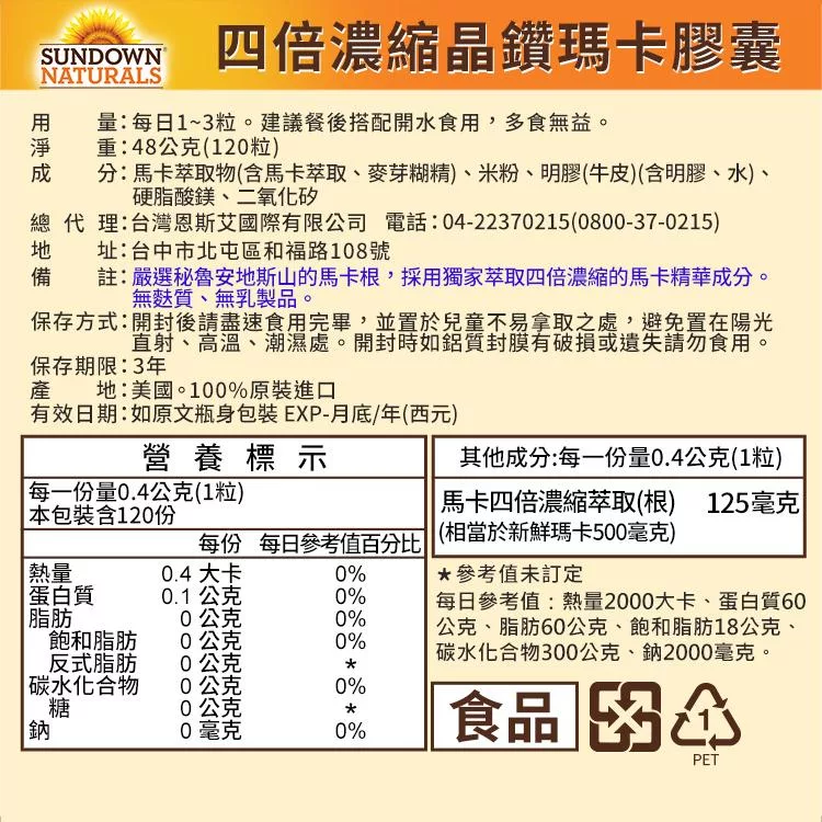 Sundown日落恩賜 四倍濃縮晶鑽瑪卡(120粒/瓶)