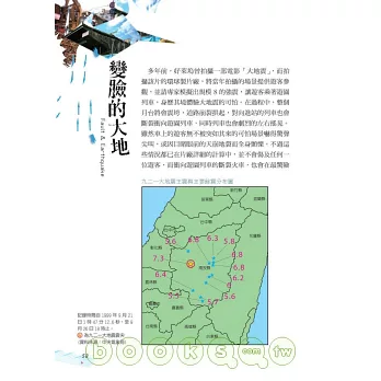 作者為台灣地理界的學者專家,對於地震成因、台灣地質與地體環境、板塊與斷層活動,以及震災特性等,均有精闢的研究。本書內容詳盡解說地震爆發的原因,除了溯及不少憾天動地的神話與歷史記錄,亦深入淺出地介紹許多科學看法與理論。希望透過一系列完整而全面性的內容紀實照片和插畫解說,讓一般大眾能學習地震的相關知識,並且更加瞭解台灣的地質環境與地震特性。