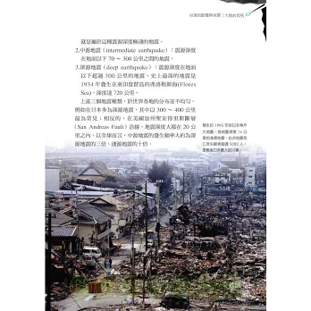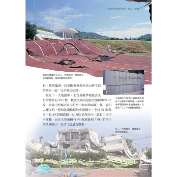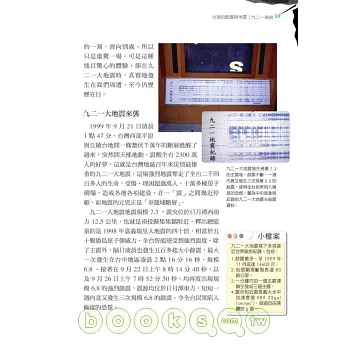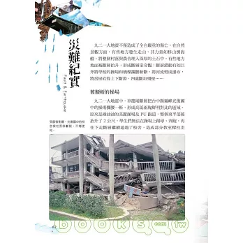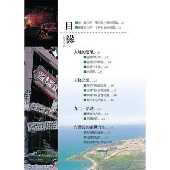 全書包含:地震的傳說與成因;世界史上重大地震介紹;台灣史上重大震災回顧;台灣島的地體和地質、板塊運動與斷層活動;九二一地震災難紀實;地震的應變與測防原理等。另有珍貴紀實照片、空照圖與翔實精確的插畫說明;附錄並收集有:台灣的地震記錄、西元63年以來世界史上災難性地震等資料。特別加入國際間重大地震珍貴畫面。