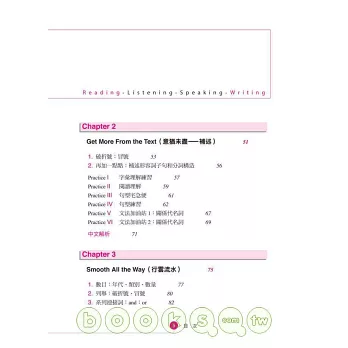 溫習組織文章的機制,例如「邏輯推理」、「對照」和「平行對等」,捷進讀者的閱讀技巧,閱讀時得以享受行雲流水般的順暢。