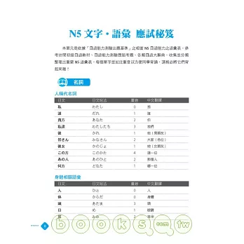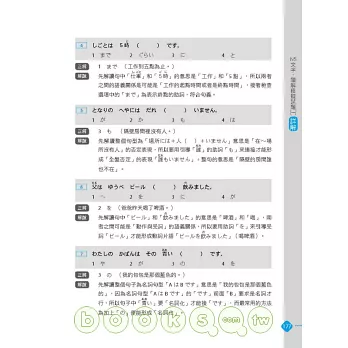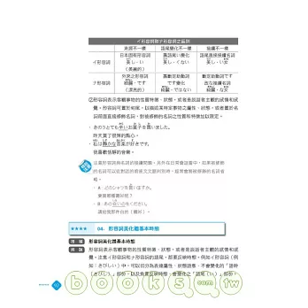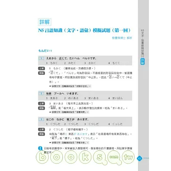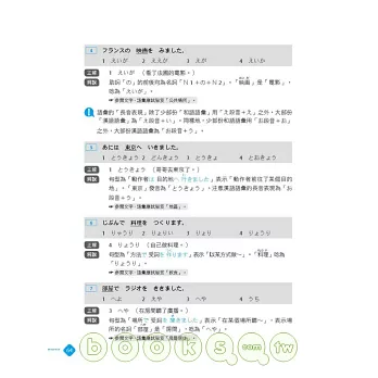 ◎ 言語知識(文字.語彙):特別為考生歸納55大類必考字彙,並且依詞性、用途、類型分類。同時,也將漢字和日文唸法分開編排,讓讀者不會記了漢字忘了唸法。並且,也列出單字重音、外來語原文、動詞三大類、自動詞他動詞、應用例句。熟讀高頻必考字彙,等於掌握通往必勝關鍵!