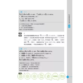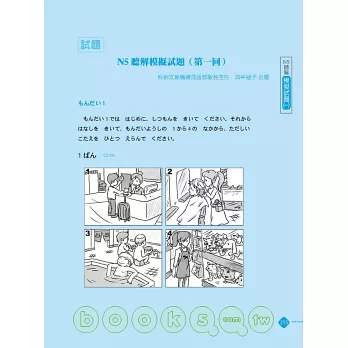 ◎ 聽解:幫助讀者揪出聽解測驗最常出現的「用句」,包括作答指示、疑問詞、姓氏、寒暄客套話、常用詢問表現、日常會話句…等。並且,為了讓讀者能夠擁有身歷其境的聽解考試情境,特別邀請標準東京腔的日籍錄音老師親自錄製聽解試題,宛如置身日檢考場!完整模擬新制日檢聽解考試情境,包括唸題速度、對話情境、試題作答時間等完全比擬實際考試,最具臨場感!